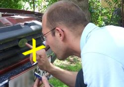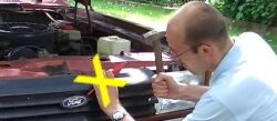![]() | Das Chrom -es befindet sich auf der Rückseite- fällt von der Plastikform herunter, der schwarze Grill wird sichtbar. |