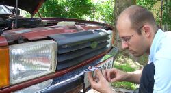 Vollste Konzentration beim Abziehen der Schutzfolie der Neu-Pflaume. |
