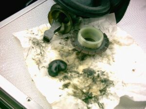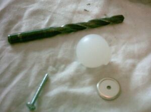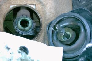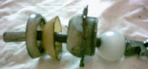 | Der untere Teil mit (von rechts nach links) Die Möbelkugel, Lagerpfanne, Plastikbeilagscheibe und das untere Lager der Druckmanschette. Die Druckmanschette ist zuletzt aufzufädeln (leider nicht im Bild). Die beiden Teile mit Gummi wieder ineinander schieben und fixieren (entweder mit den Metallfingern oder wie in meinem Fall einer Blechschraube) |