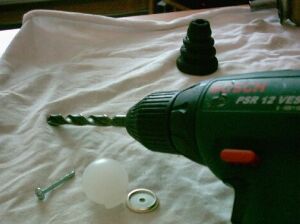 | Der Möbelgriff von Obi (es gibt ihn auch bei Bauhaus) bekommt ein entsprechendes Loch aber nicht mit dem Akkuschrauber, weil das Loch mit einer Handbohrmaschine niemals gerade wird. |