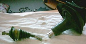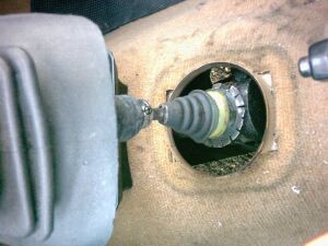 | Der Ganghebel verliert augenblicklich den Halt wenn das Plastikkugellager bricht. Reste davon sieht man auf dem Blatt Papier im unteren Teil des Bildes (der weiße Fleck mit dem dunklen Punkt ;-) ) |