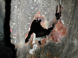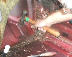 Der Hammertest bestätigt: Noch hält die Sache! Viele Löcher, aber keine tragenden Teile, die wegbrechen. |