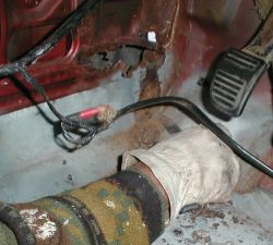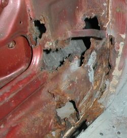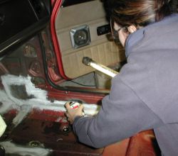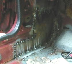 Darunter verbirgt sich noch allerhand entferntes Blech, plangeschliffene Kanten, Rostumwandler, Stützbleche und Karosseriedichtmasse. |