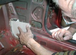 Anpassen eines Reperaturblechs mit dem Schnittmuster aus dem Burda-Heft. |