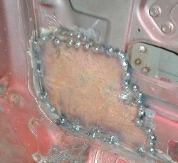 Dann noch die Kanten des Blechs mit Dichtmasse (weiss) abgedichtet, und bei der Gelegenheit gleich noch ein wenig Hohlraumschutz eingesprüht. |
