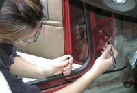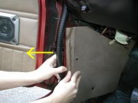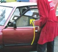 Türe hinten nach oben ziehen, und dazu möglichst weit schliessen. Dann die 3 Schrauben (SW 13) lockern. |