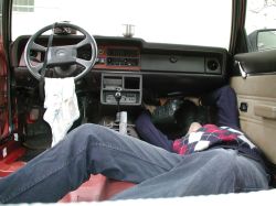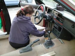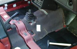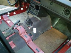 Ganghebelmanschette und Handbremse einfädeln sind die lästigen Arbeiten beim Teppich-Einziehen. |
