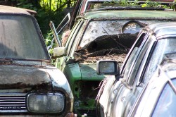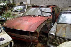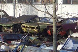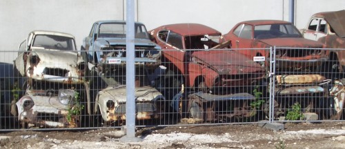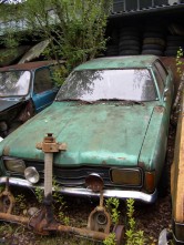 Diese Fotos hat teilweise Stefan L. herausgeschmuggelt, als er auf der Suche nach einer Motorhauben-Zierleiste für einen Granada war. Die anderen Fotos entstanden im Rahmen einer längeren Umbauaktion, wo der Schrotter 3000 m2 von seinem Freigelände zum Quadratmeterpreis von 130 EUR an einen dieser Nachbarn verkauft hatte und 700 Autos entfernen mußte.